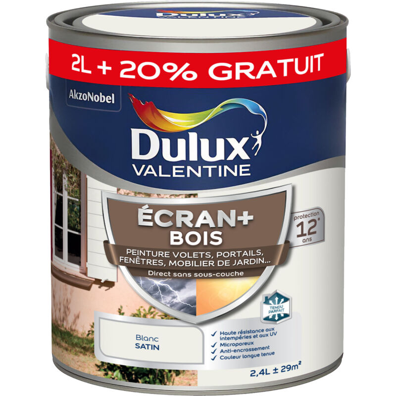 Peinture extérieure Ecran + bois Dulux Valentine satin blanc 2L +20% gratuit