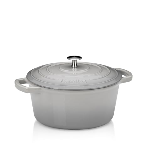 kela Bräter Gusseisen rund 4,6 Liter, Dutch Oven CALIDO, Induktion Gussbräter mit Deckel, Gusseisen Topf Brot backen, emailliert, hellgrau