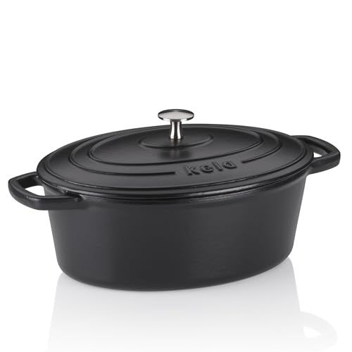 kela Bräter Gusseisen oval 6 Liter, Dutch Oven CALIDO, Induktion Gussbräter mit Deckel, Gusseisen Topf Brot backen, emailliert, schwarz
