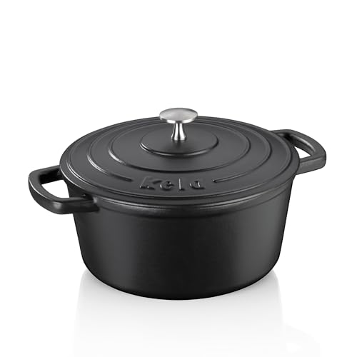 kela Bräter Gusseisen rund 4,6 Liter, Dutch Oven CALIDO, Induktion Gussbräter mit Deckel, Gusseisen Topf Brot backen, emailliert, schwarz