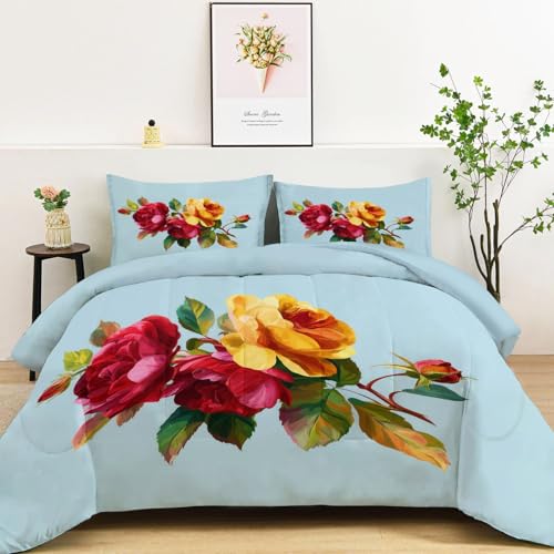 Couette 135x200 Plante Rose Rose Bouquet Gypsophile, Couette Réversible Bleu clair pour 1 Personnes, Duvet 4 Saisons Legere Respirant sans Housse + 2 Taies d'oreiller 65x65 - Lavable en Machine