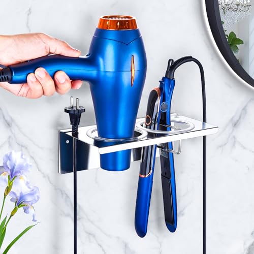 GGQ Support Seche Cheveux Autocollant et Perçable, Porte Seche Cheveux Mural, Porte Lisseur Mural, Accroche Support Lisseur, Porte Seche Cheveux et Lisseur, Rangement Seche Cheveux en Acier Inoxydable