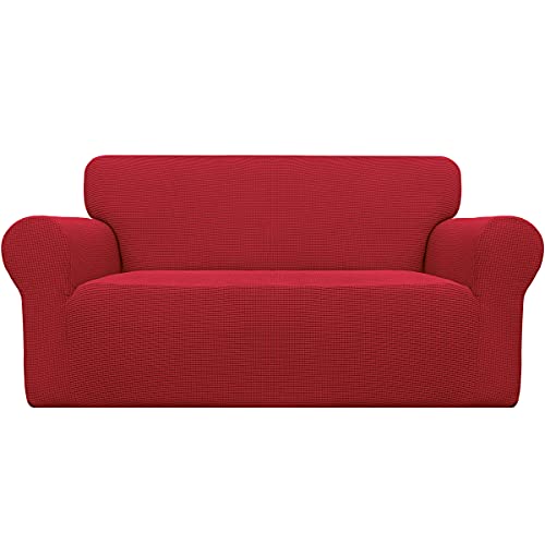 Easy-Going Housse de canapé extensible - 1 pièce - Housse de protection de meubles douce avec élastique en bas pour enfants, tissu jacquard polyester élasthanne, petits carreaux (causeuse, rouge Noël)