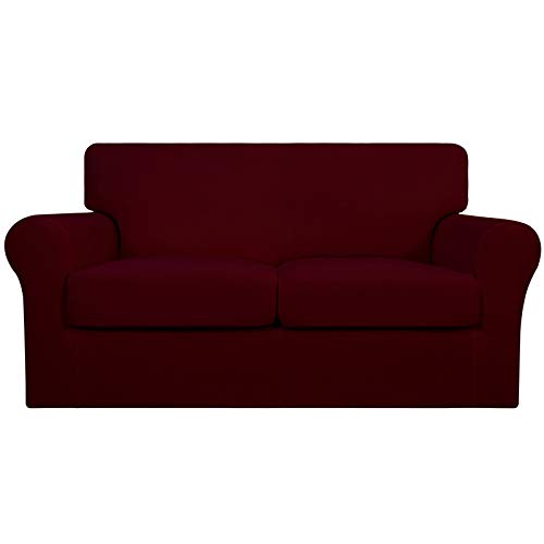 Easy-Going Lot de 3 Housses de canapé, Extensibles, Douces, lavables et 2 Coussins séparés, Protection de Meubles pour Animaux de Compagnie, Enfants (Loveseat, Bordeaux, Taille M)