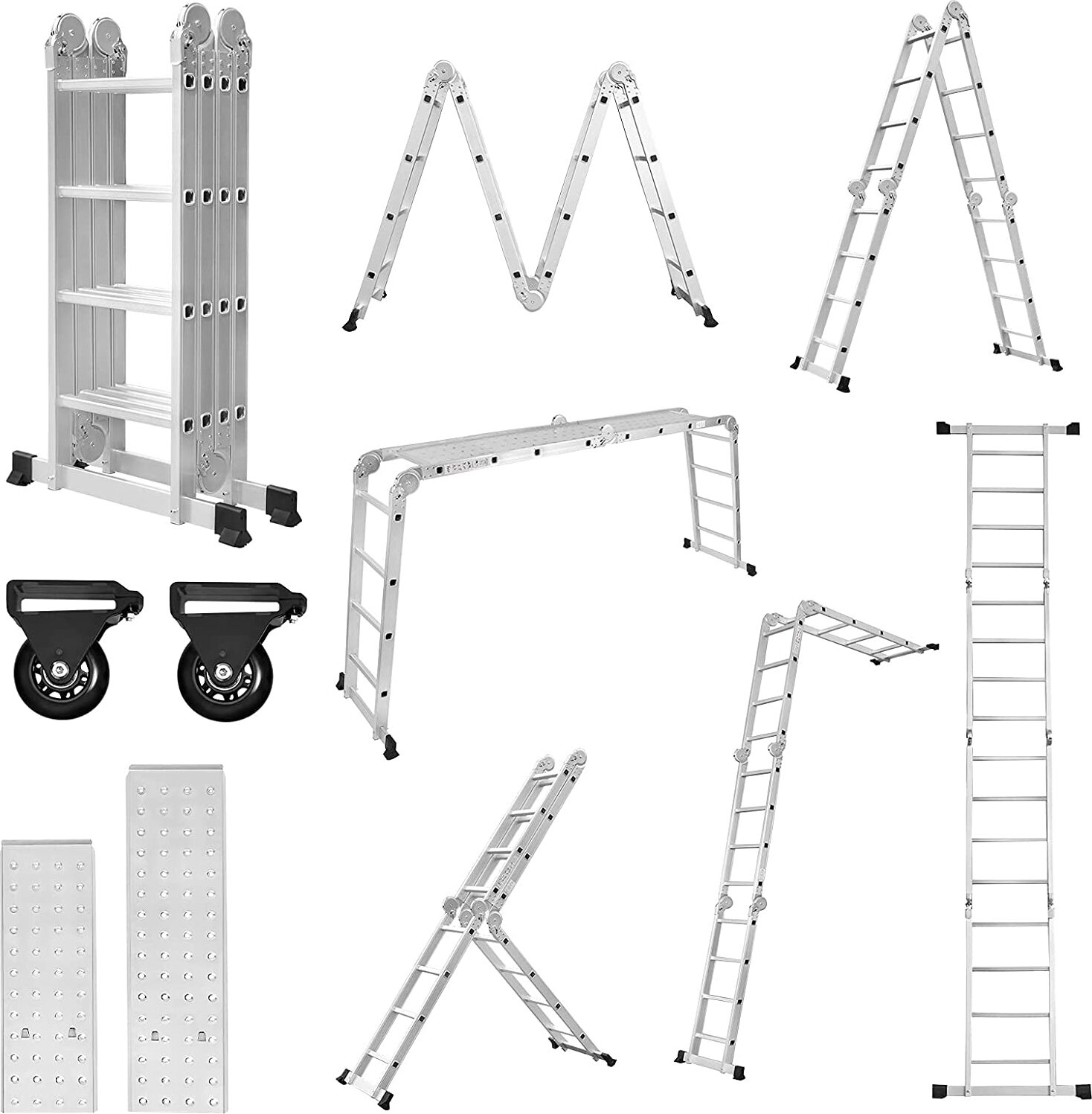 VA-Cerulean Echelle multi-usage, échelle en alliage d'aluminium, échelle multifonction Echafaudage, jusqu'à 150 kg, 16 marches avec 2 plaques d'échafaudage, argent