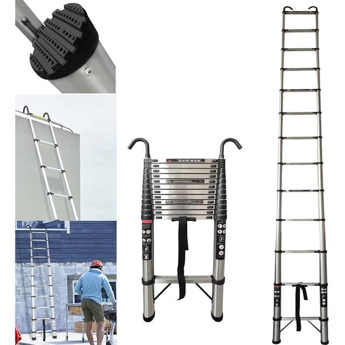 Échelle Escamotable 5 Mètre Échelle Télescopique en Acier inoxydable Échelle de Grenier avec Crochets de Toit Extension Échelles