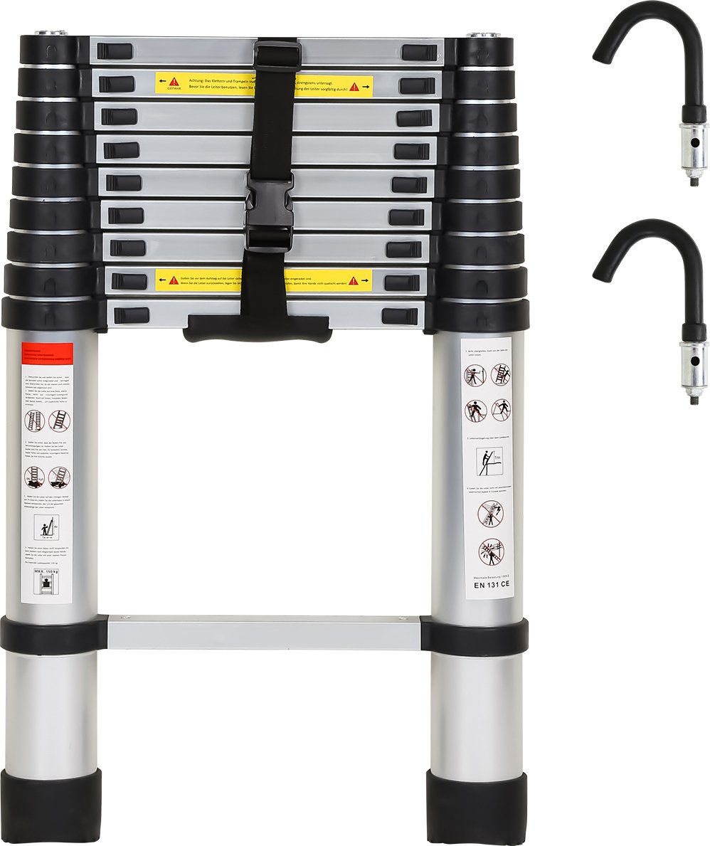 Eulenke Échelle télescopique 2,6 m avec 2 Crochets Amovibles, echelle Pliante en Aluminium, Portable et Antidérapante escabeau Charge jusqu'à 150 kg, Échelle Extensible Multi-usages Haute sécurité