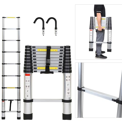 HBTower Escamotable en Aluminium,Echelle telescopique 2.6M/8.5FT avec Crochets,Echelle plianteConvient aux Camping-Cars, greniers, extérieurs et intérieurs, Charge Max 150 kg (Argenté)