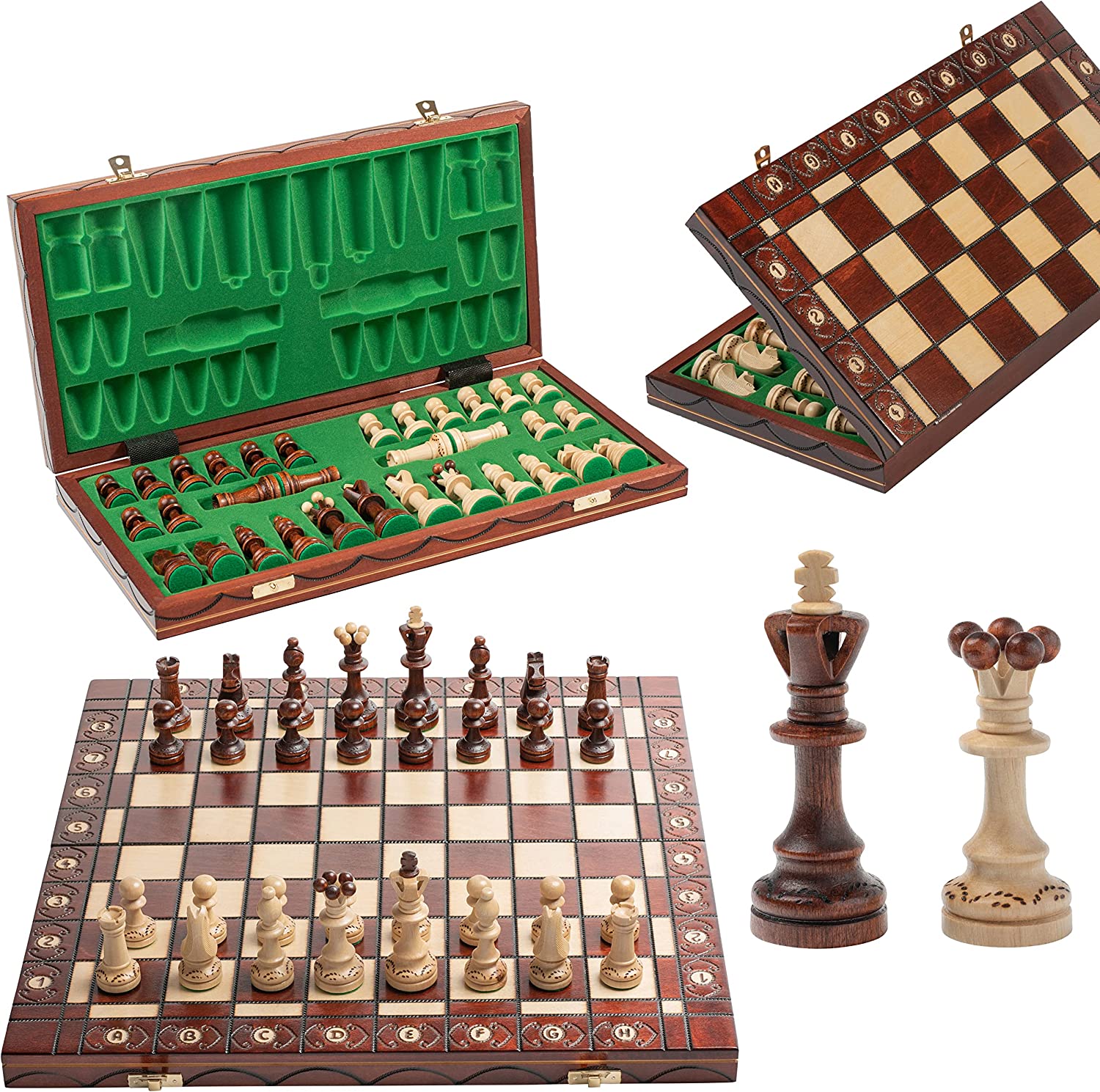 Grand jeu d'échecs en bois SENATOR 41 cm x 41 cm. Décorations gravées sur l'échiquier et les pièces.