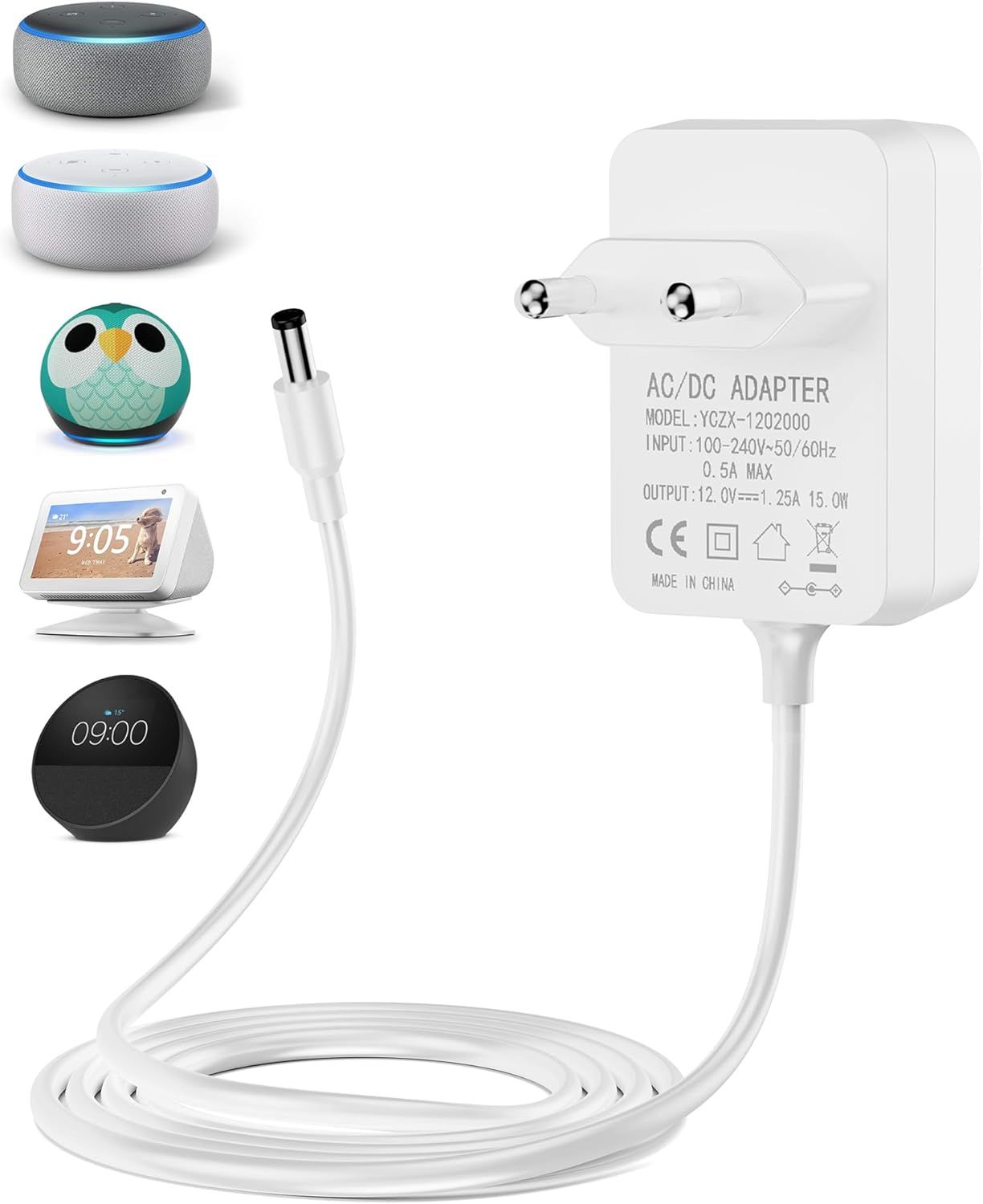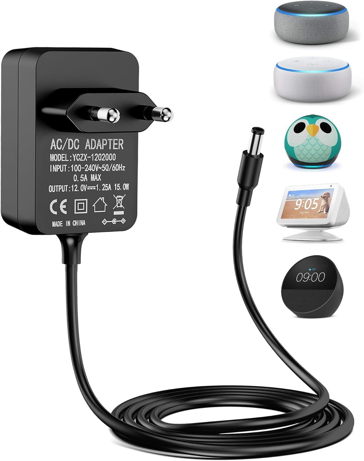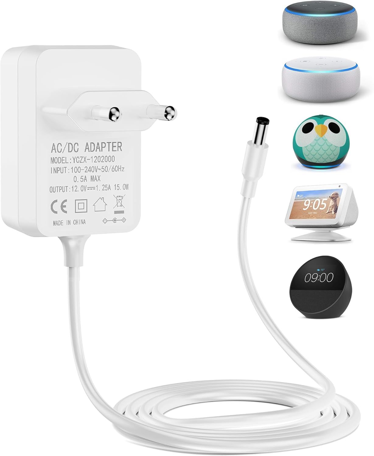 Chargeur Adaptateur 15 W pour Echo Dot 3e, 4e et 5e génération, Echo Show 5 1re/2e génération, Echo Spot, Echo Pop, Alimentation 12 V 1,25 A avec câble de 1,5 m, sûr et Stable