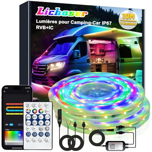 Lichaser 12V Bande LED Camping Car IP67, Lampes éclairage pour Camping Car RGB+IC avec Application et Télécommande, Convient pour l'éclairage Intérieur et extérieur des Caravanes de Camping-car (10m)