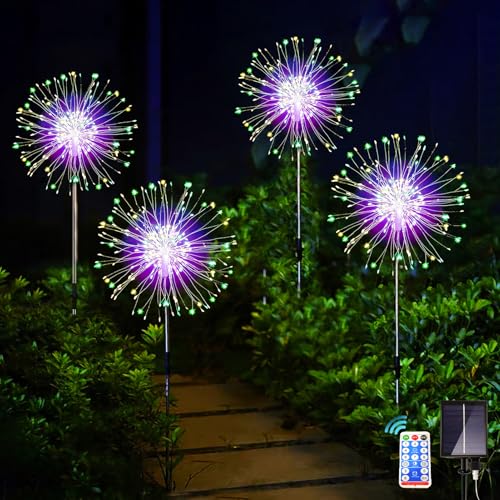 Joycome Lampe Solaire Exterieur Jardin 4 x 120 LED Feu d'artifice Solaire avec Télécommande, 8 Modes Étanche Éclairage Extérieur Solaire de Pissenlit pour Jardin Pelouse Terrasse Deco - Blanc Chaud