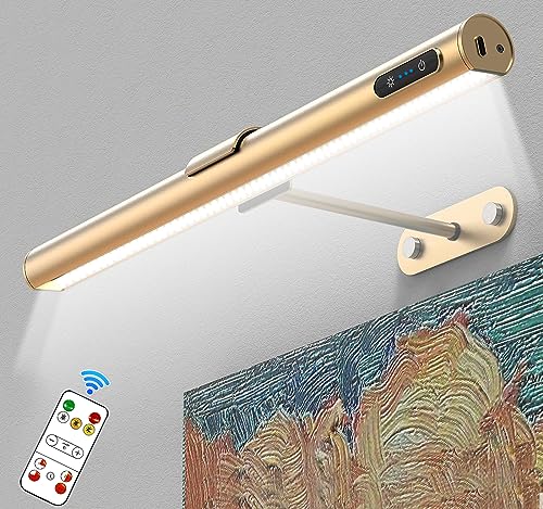 WILLED Applique Murale pour Tableaux, 3W Rechargeable Éclairage Tableau LED Sans Fil avec Télécommande, 3 Températures de Couleur et fonction minuterie, Dimmable Lampe Murale à pile pour Photos, Or