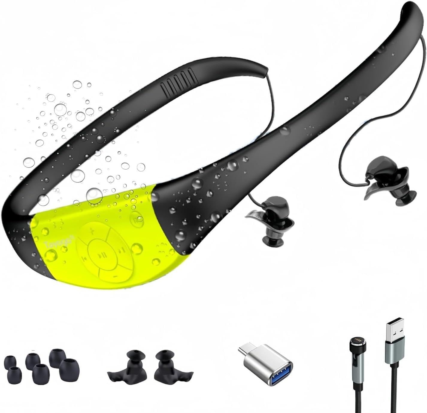 Ecouteur Natation, Lecteur MP3, Memoire 8GB, Etanche IPX8, Charge Magnétique et Autonomie 20 Heures, Mode MP3/FM, pour la Natation (Piscine) et Sport (Jaune)