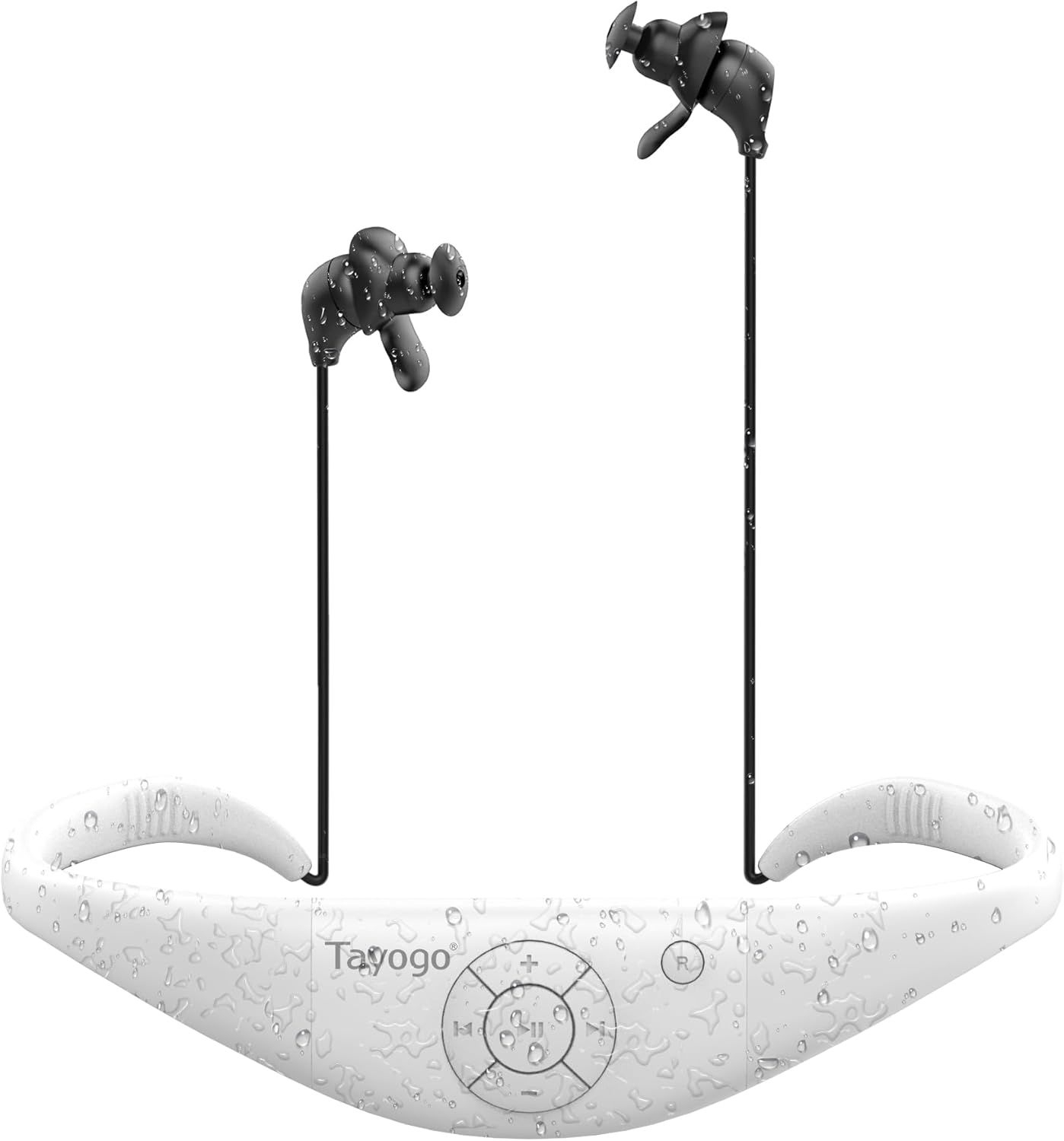 Tayogo Ecouteur Natation, Lecteur MP3, Memoire 8GB, Etanche IPX8, Charge Magnétique et Autonomie 20 Heures, Mode MP3/FM, pour la Natation (Piscine) et Sport(Blanc)