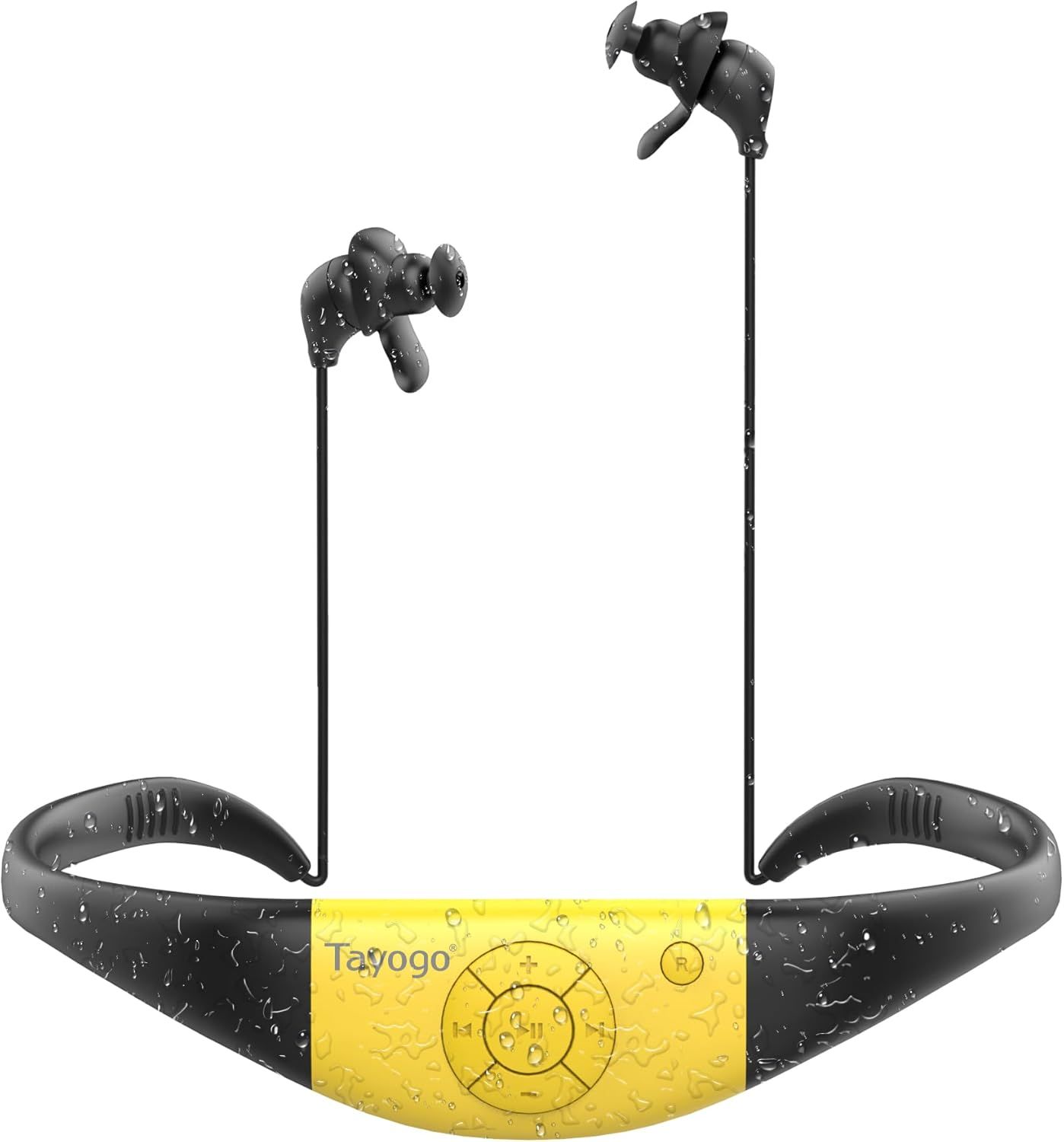Tayogo Ecouteur Natation, Lecteur MP3, Memoire 8GB, Etanche IPX8, Charge Magnétique et Autonomie 20 Heures, Mode MP3/FM, pour la Natation (Piscine) et Sport (Jaune)