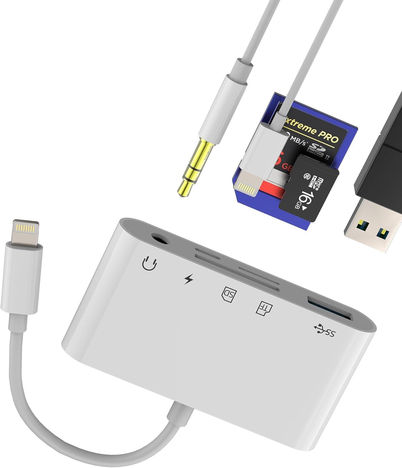Adaptateur Lightning Vers USB OTG 3.0 (5en1)pour Apple iphone 14 Lecteur Carte SD Micro SD Jack Ecouteur 3.5mm Pour ipad Chargeur Cable Casque Auxiliaire Splitter Compact Card Reader TF Photo Mémoire