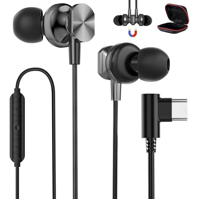 Écouteur USB C pour Google Pixel 10 9a 8a Ecouteur USB Type C Magnétique Filaire Casque Coudé à 90 Degrés Intra Auriculaire avec Micro pour iPhone 17 16e 15 Air Samsung A16 A17 A56 S25 Oneplus 15 noir