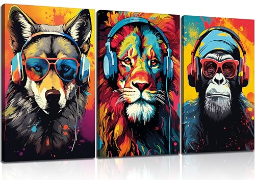 Lot de 3 impressions sur toile de graffiti animalier, images avec écouteurs, lunettes de soleil, gorille, tigre, loup, gamer, peintures graffiti colorées pour adolescents, décoration murale encadrée