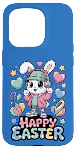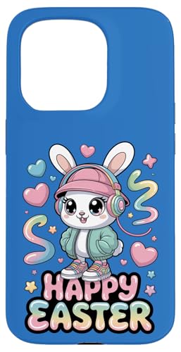Lapin de Pâques Kawaii avec écouteurs Pastel Happy Easter Coque pour iPhone 15 Pro
