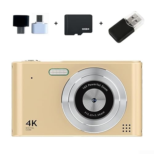 Besshepplo Appareil photo numérique 4K avec résolution photo 48 MP, zoom numérique 16x, écran 2,4", anti-tremblement, détection de visage et fonction accéléré, design compact léger et idéal (doré 32