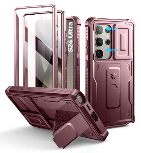 Dexnor pour Coque Samsung Galaxy S24 Ultra【Double Cadre Avant et Support】 avec CaméRa Coulissante Intégrée & Protecteur d'écran, Coque de Protection Robuste Résistante Aux Chocs - Rouge Magique