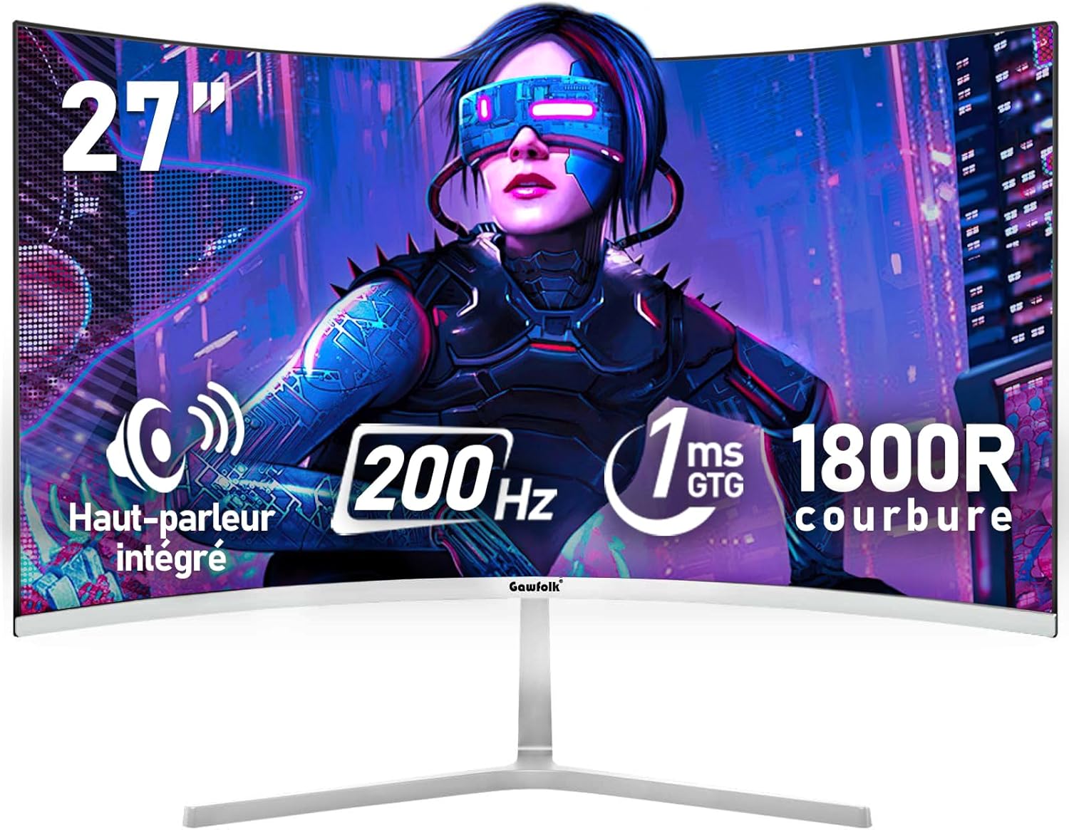 Gawfolk Écran PC 27 Pouces incurvé 200Hz Gaming Computer Moniteur, 1800R,1ms,FHD 1080p, 178 ° Grand Angle,Haut-Parleur intégré, HDMI、DisplayPort,Compatible avec Montage Mural 100 * 100mm- Blanc
