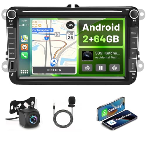 [2+64GB] Hikity Android Autoradio Wireless Carplay pour VW Golf 5 6 Touran Polo Skoda Passat, Écran Tactile 8 Pouces Poste Radio Voiture Bluetooth, Android Auto, GPS, WiFi, FM RDS, Caméra de Recul