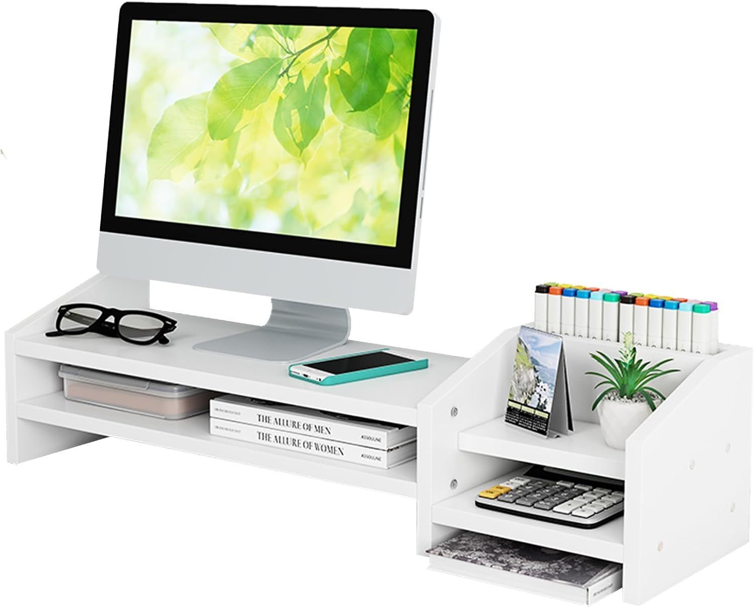 ETHU Support de Moniteur Réhausseur d’Écran Support d'Ordinateur Lever PC Ecran, 3 niveaux de longueur et angle réglables avec support pour téléphone et tiroir, accessoires de bureau
