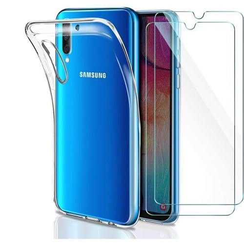 HQ-CLOUD® Coque pour Samsung Galaxy A50 Transparente Silicone en Gel TPU Souple + 2 Verre trempé Film Protection écran - Anti Rayures - Ultra Résistant Dureté 9H
