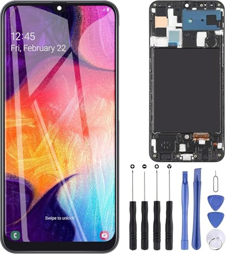 OLED Écran pour Samsung Galaxy A50 LCD Ecran pour Galaxy A50 SM-A505F, SM-A505G, SM-A505W LCD Display Écran Tactile Digitizer Assembly Réparation Kit, Noir avec Cadre, Support Empreintes Digitales