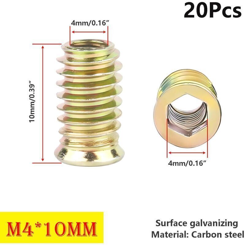 20 Pièces Ecrous Hexagonaux Filetés, Inserts Filetés en Bois, M4x10mm Écrous Filetés, Insert à Visser, pour Meubles