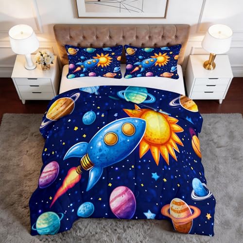 Couette 135 x 200 cm 4 Saisons, Couette sans Housse Enfant Motif Dessin Animé Astronomie Fusée Soleil, Édredon Individuel Chaud Respirant Confortable avec 2 Taie d'oreiller 64 x 64 cm, Bleu foncé