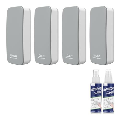LOUKIN Lot de 4 gommes magnétiques effaçables à sec pour tableau blanc, effaceur de tableau en verre (gris), deux bouteilles de nettoyants pour tableau blanc de 100,5 ml inclus, pour salle de classe,