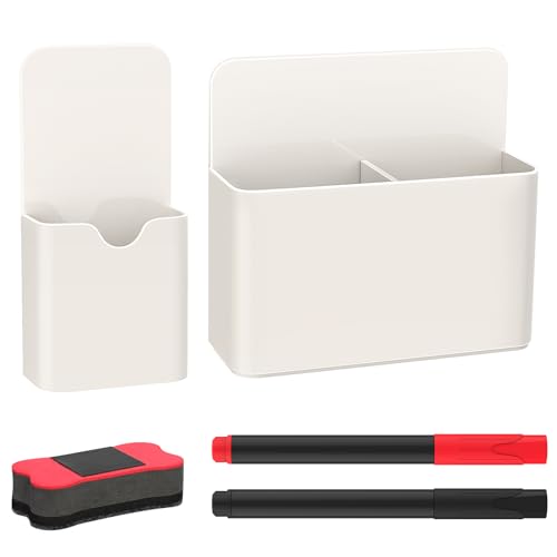 MoKo Boîte de Rangement Magnétique, Lot de 2 Support de Crayon avec 2 Marqueurs & 1 Effaceur à Sec pour Tableau Blanc, Porte-Marqueur avec 2 Compartiments pour Réfrigérateur Surface Magnétique, Blanc