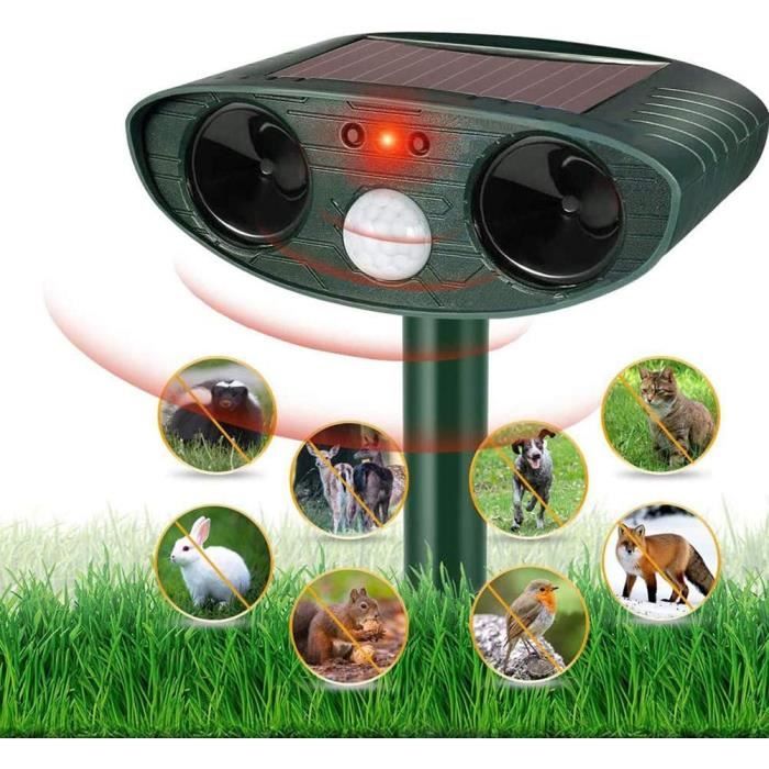 Répulsif ultrasonique pour animaux à énergie solaire, dissuasif anti-effaroucheur de chien de renard de chat imperméable extérieur à piles avec 2 haut-parleurs pour la ferme de terrain de jardin
