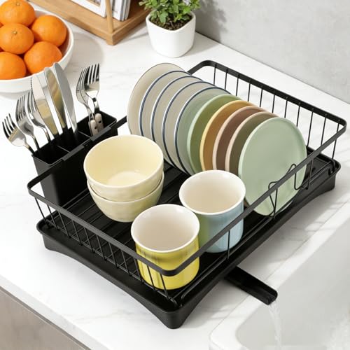 Cozary Egoutoire Vaisselle Cuisine avec Bec Rotatif 360°, Égouttoir à Vaisselle avec Porte-ustensiles, Range Vaisselle Egouttoir en Acier Carbone avec Drainage Automatique(43x33x15cm)