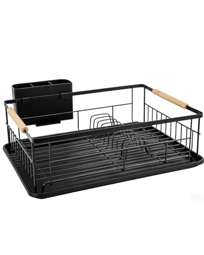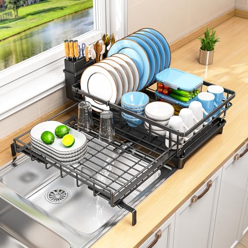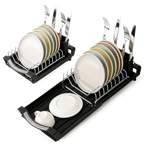 OrderlyGo Egouttoir Vaisselle, Extensible Égouttoir à Vaisselle avec Porte-ustensiles, Économisez de l'espace Egoutoire Vaisselle Cuisine et Drainage Automatique, pour Cuisine, Noir