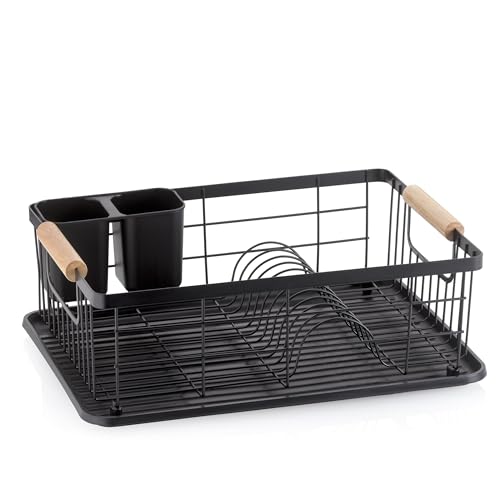 kela Egouttoir à Vaisselle Rica, métal, Noir, Place pour 11 Assiettes et 5 Verres, 2 Porte-Couverts en Plastique, poignées en hévéa, 11714