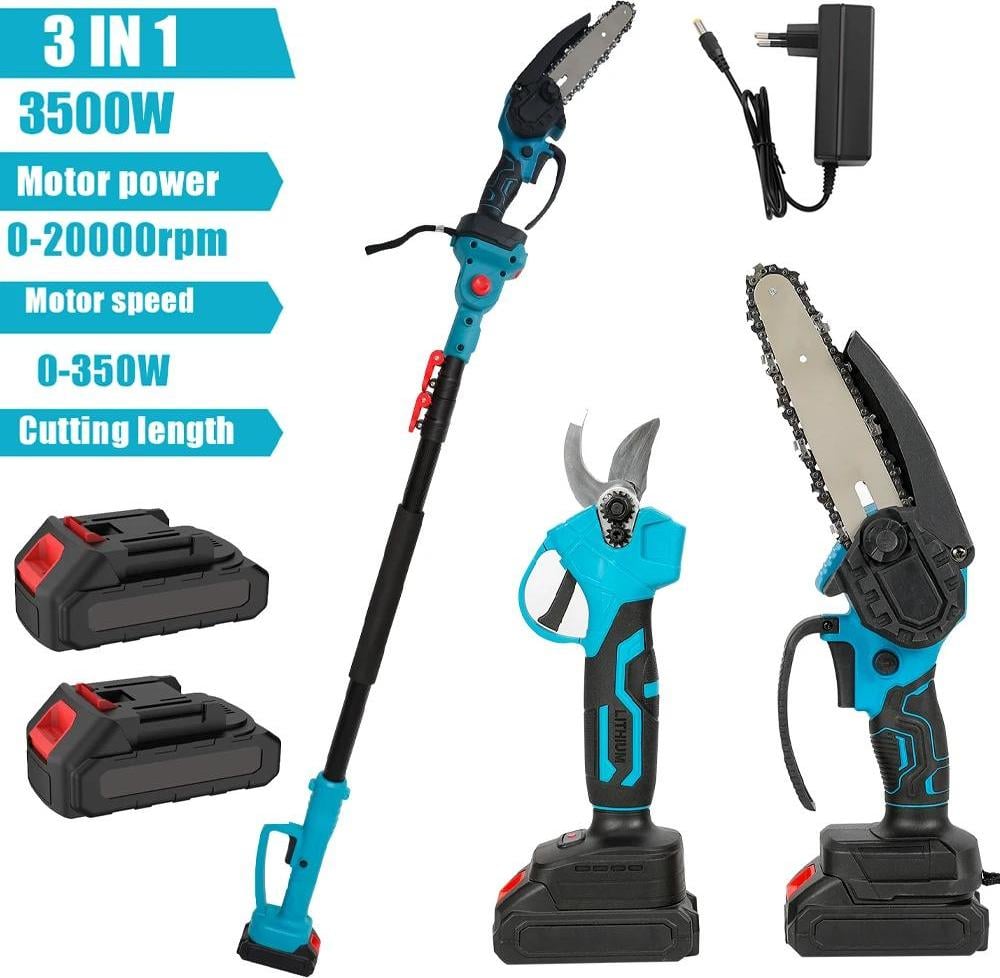 Elagueuse sur batterie + élagueuse sur batterie 3 en 1 Tronçonneuse sur batterie sans balais Sécateur de jardin électrique Extensible jusqu'à 2 m avec 2 batteries