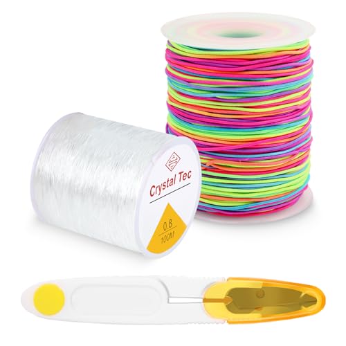 Dengthrive Fil Elastique pour Bracelet: 2 Rolls Fil pour Bracelet 1mm 0.8mm Ciseaux Fil Bracelet Elastique Convient pour Les Loisirs Créatifs la Fabrication de Bijoux et de Colliers 100 m/Spool