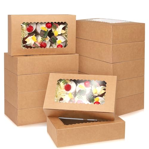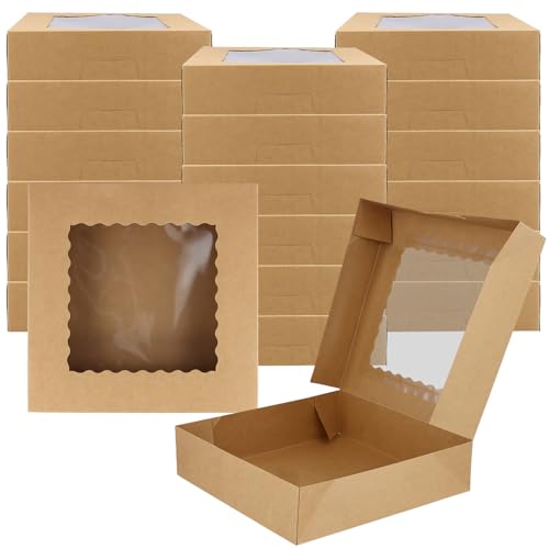 SINJEUN Lot de 20 boîtes à gâteau marron de 26 x 26 x 6,35 cm avec fenêtre, boîtes à biscuits et desserts en carton pour emballage cadeau