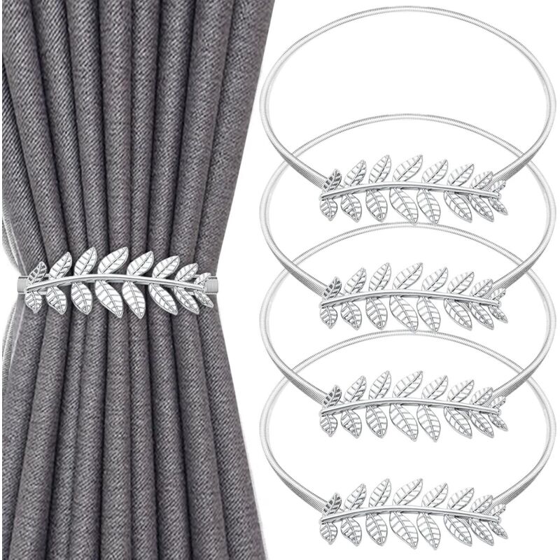 Lot de 4 Embrasse pour Rideaux, Attache Rideau Strass en Forme de Feuille Argentée, Embrasse Rideau avec Corde à Ressort Réglable, Attache Rideaux