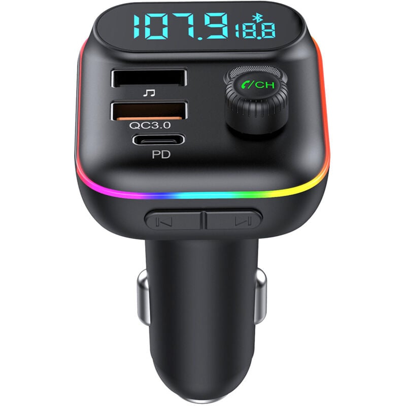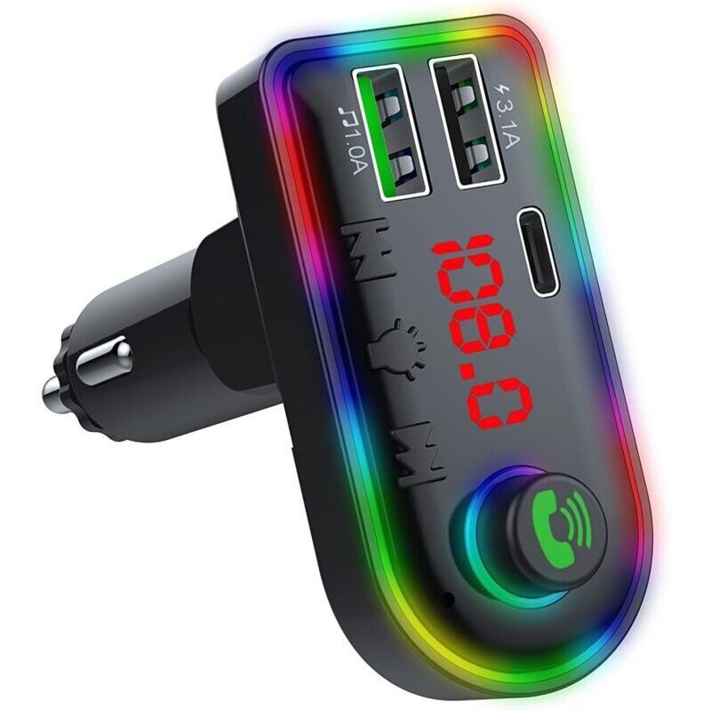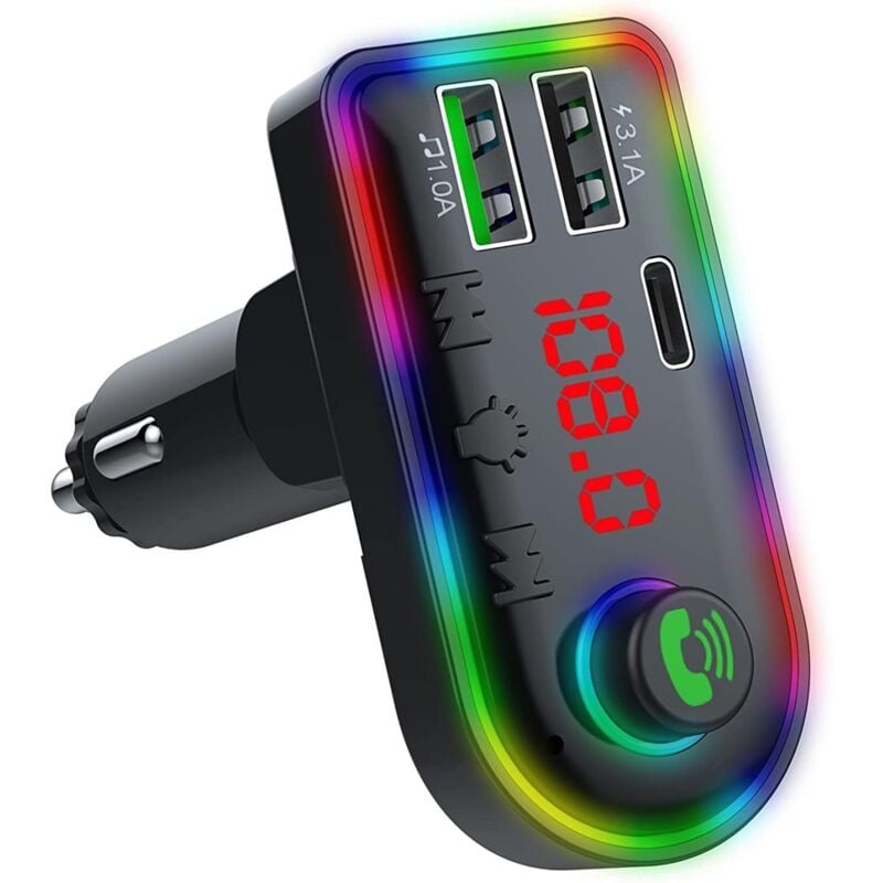 Émetteur FM Bluetooth 5.0 pour voiture – Charge rapide 3,1 A – Adaptateur allume-cigare avec éclairage d'ambiance 7 couleurs