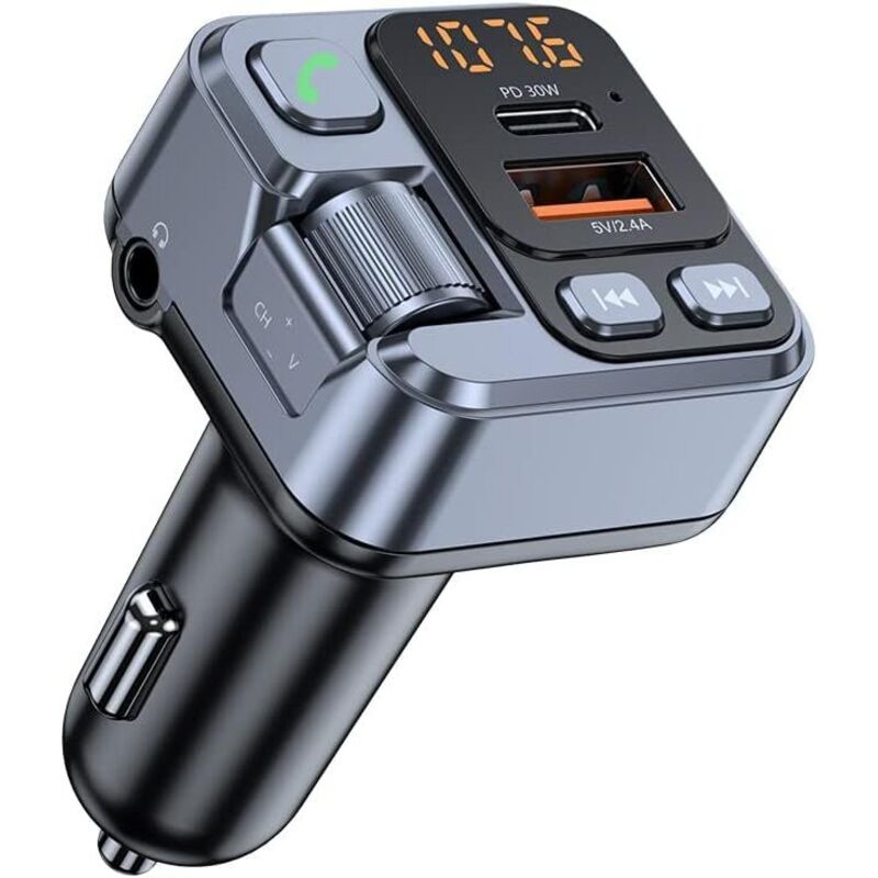 Émetteur FM Voiture, Adaptateur Bluetooth 5.3, Métal, 2 Ports Charge Rapide (PD 30W + QC3.0 18W), Radio sans Fil, Son Grave, Appels Mains Libres,