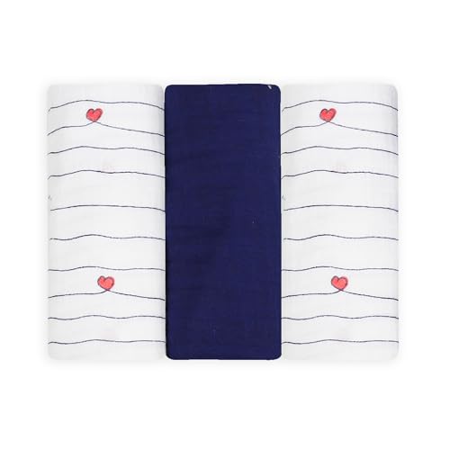 Trois Kilos Sept - Lot 3 Langes Bébé - Naissance - Multi-Usage : Emmaillotage, Allaitement, Change, Couverture Légère - 100% Coton Oeko-TEX® Standard 100 - Bleu Marine - Motif Rayés Coeur - 70x70 cm