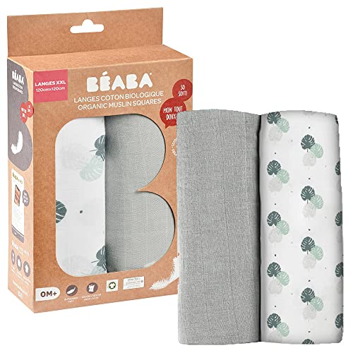 BÉABA, Lot de 2 Langes Bébé, Mousseline de Coton Biologique, Multi-usages : Couverture emmaillotage, Bavoir, Couverture nomade, Doudou, Ultra doux, Respirant,120cm, Ecologique et Sain, Gris/Jungle