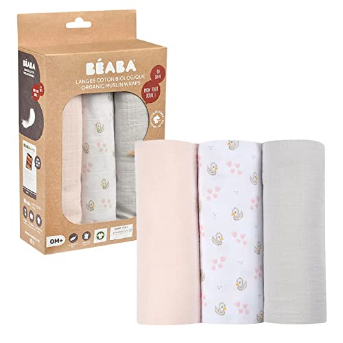 BÉABA, Lot de 3 Langes Bébé, Mousseline de Coton Biologique, Multi-usages : Couverture emmaillotage, Bavoir, nomade, Doudou, Ultra doux, Respirant, 70x70, Ecologique et Sain, Motif Cygne