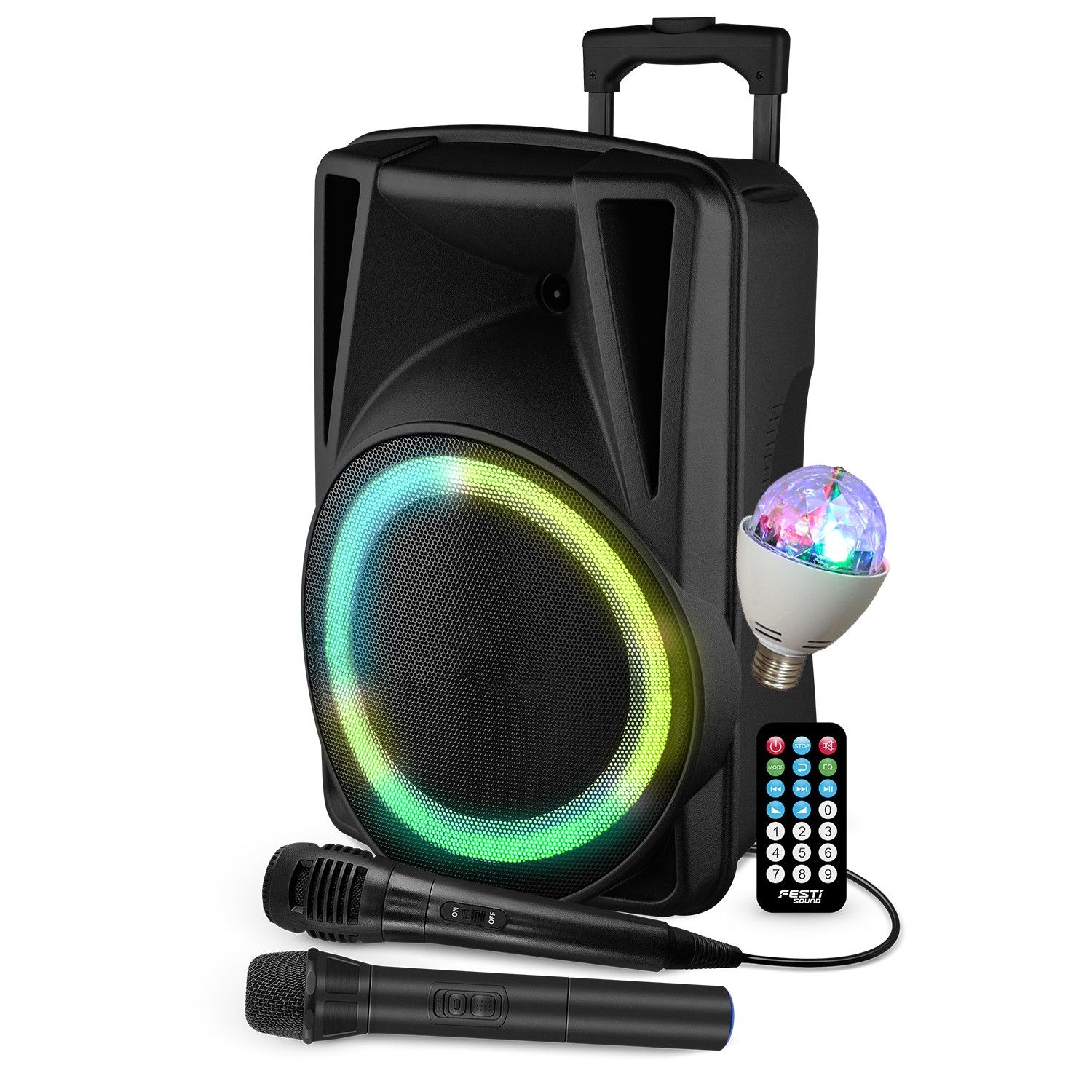 Enceinte Active - FestiSound FESTI12 - 12" 31CM - 600W - Batterie - RING LED - USB SD Bluetooth TWS - 2 Micros + Ampoule
