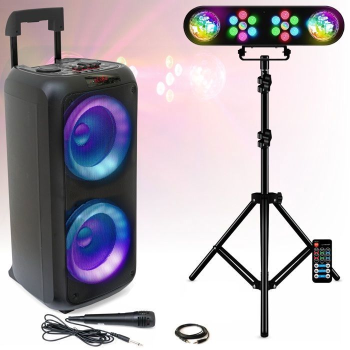 Pack Karaoké Enceinte sur Batterie Bluetooth 600W USB AUX SD TWS - Pied Lumière 4-en-1 Projecteurs PAR Astro Boum Enfant Cadeau